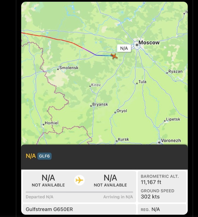 Tài khoản trên mạng xã hội X (trước đây là Twitter) OSINTdefender loan tin: "Chiếc máy bay phản lực thương gia Gulfstream G650ER đã khởi hành từ thủ đô Washington D.C vào ngày hôm qua và được cho là thuộc sở hữu của ông Steve Witkoff, đặc phái viên Trung Đông và trợ lý thân cận của Tổng thống Mỹ Donald Trump, đã đi vào không phận Nga và đang tiếp cận Moscow".
