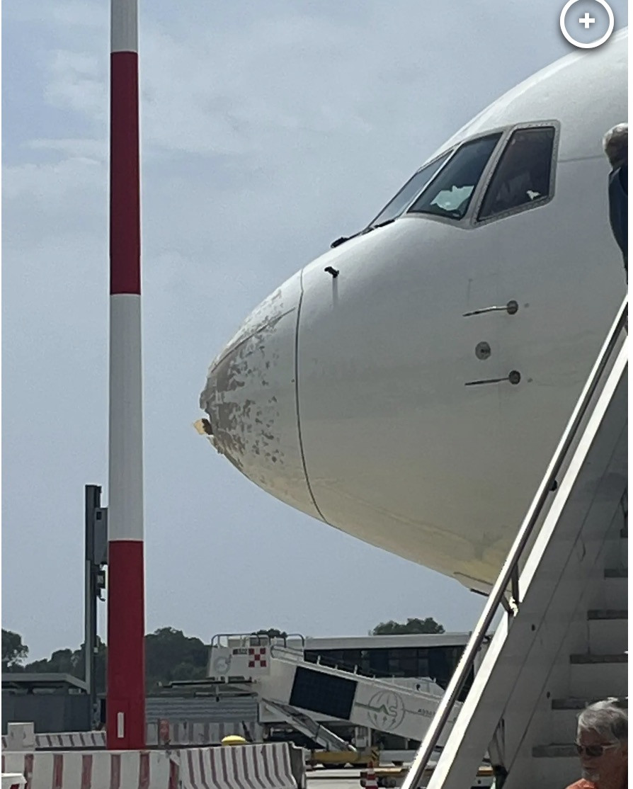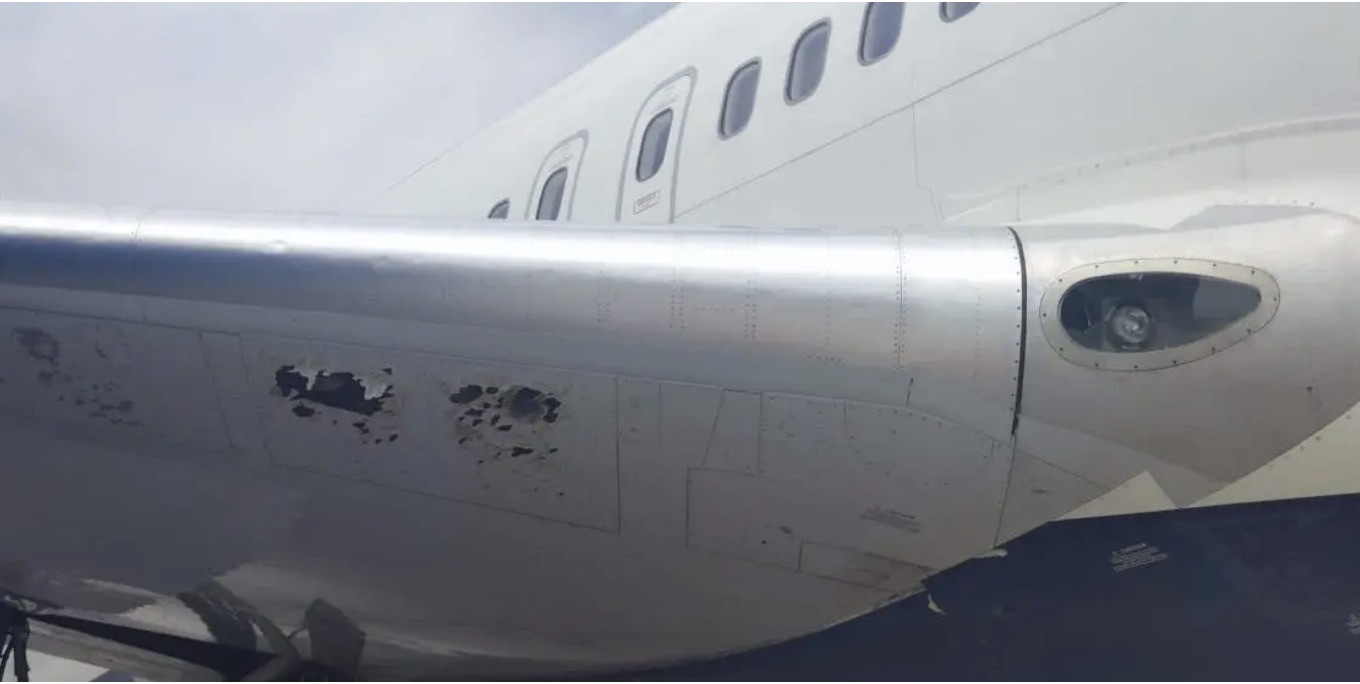 Hình ảnh do các hành khách đăng tải trên mạng cho thấy, mũi máy bay bị thủng một lỗ lớn, trong khi phần cánh bị hư hại.