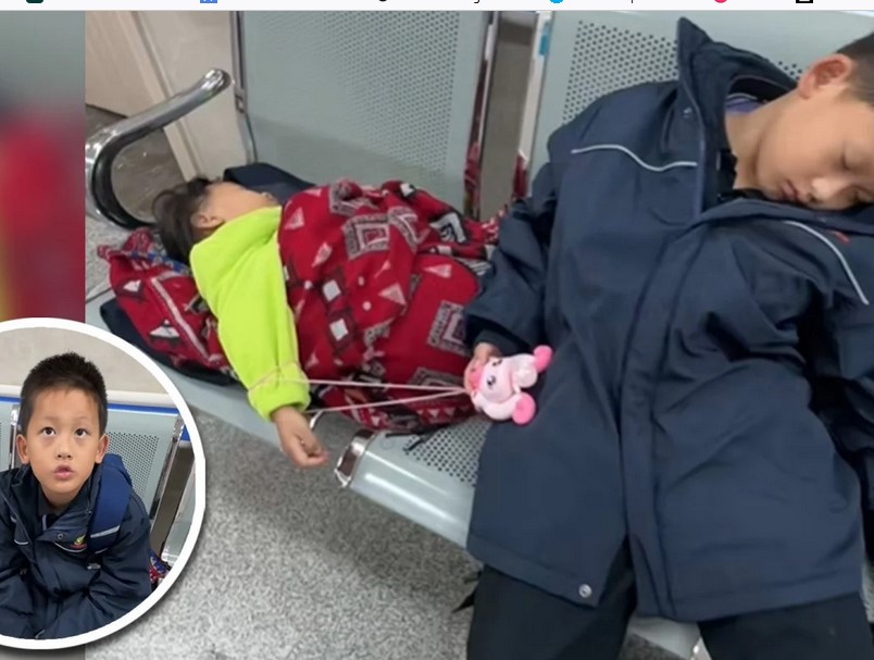 Trước khi vào phòng khám kiểm tra vết thương, Xiaoyu nhắc nhở con trai 8 tuổi để ý em gái mới 3 tuổi đang ngủ trên ghế chờ của bệnh viện. Xiaoyu nói cậu bé nên thức trông em, đề phòng có người bắt cóc.