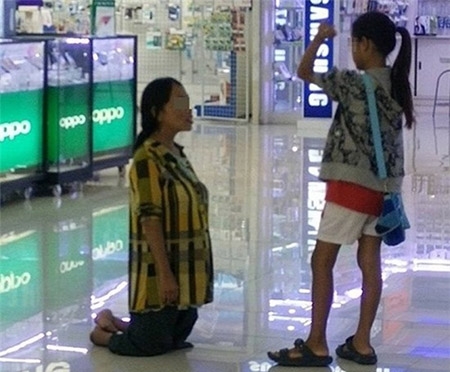 Hình ảnh một người mẹ tàn tật quỳ gối trước mặt cô con gái 15 tuổi tại trung tâm thương mại Habour Mall, Thái Lan vì không đáp ứng được yêu cầu mua điện thoại cho con đã khiến cư dân mạng nước này phẫn nộ.