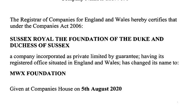 Vào ngày 26/8, trang Daily Mail đưa tin, cặp đội đã chính từ đổi tên Quỹ Hoàng gia Sussex trở thành Quỹ MWX. Dựa theo các thủ tục giấy tờ công khai thì việc chuyển đổi này chính thức diễn ra vào ngày 5/8/2020.