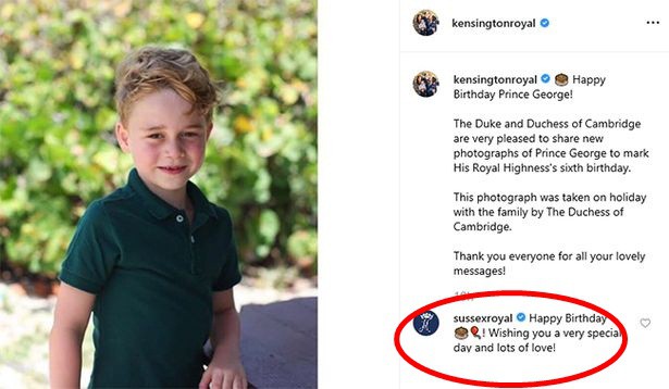 Giống như sinh nhật của Hoàng tử Louis và Công chúa Charlotte trước đó, vợ chồng Hoàng tử Harry - Meghan Markle cũng gửi lời chúc mừng sinh nhật cháu trai trong phần bình luận bức ảnh mới của Hoàng tử George trên Instagram.