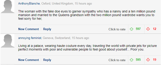 "Người phụ nữ với đôi mắt giả nai để thu hút sự đồng cảm của người khác. Cô đang sống ở biệt thự 10 triệu bảng, kết hôn với cháu trai Nữ hoàng Anh với tủ quần áo 2 triệu bảng, cô còn muốn điều gì nữa đây", ý kiến bình luận khác.