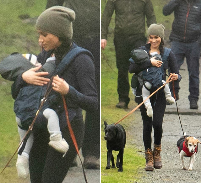Đi theo 2 mẹ con Meghan Marle là cặp vệ sĩ thuộc đội an ninh hoàng gia. Thời gian này, Meghan đang mong đợi đoàn tụ chồng tử Anh trở về. Trong hình ảnh báo chí ghi lại được từ chuyến đi dạo đầu tuần của Meghan Markle, cô đội mũ màu xanh lá cây, mặc quần legging đen và đi đôi giày leo núi màu nâu cao trên mắt cá chân. Trong khi đó, Archie mặc bộ đồ màu trắng và đeo bốt. Meghan vừa sải bước đi bộ vừa liên tục cười tươi. Cô thỉnh thoảng cúi xuống nựng con trai.