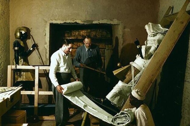 Sau khi đẩy cánh cửa lăng mộ ra, nhóm khảo cổ bị sốc khi thấy vàng, vô số báu vật bằng vàng bạc và những chiếc quan tài tinh xảo. Họ cũng khám phá ra chiếc quách đá chứa quan tài bằng vàng khối đựng xác ướp Vua Tut. Phía trên quan tài có một tấm bia đất sét với dòng chữ: "Dù là ai, nếu đã làm phiền đến giấc ngủ của vua Tutankhamun thì sẽ phải chết".