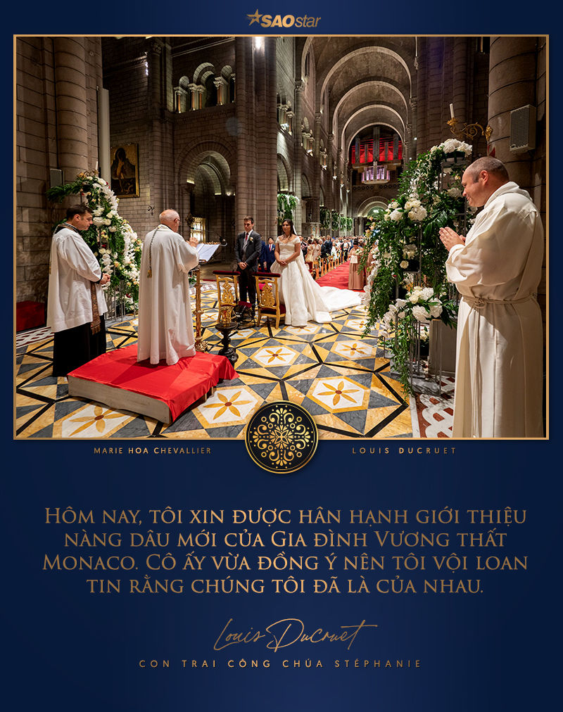 Hôn lễ diễn ra dưới những cánh hoa, giữa sự chúc phúc của quan khách cùng không khí trang nghiêm mà lãng mạn ở ngôi nhà thờ cổ kính. Thân vương Albert cùng vợ là Thân vương phi Charlene tham dự cùng Công chúa Stéphanie - mẹ của chú rể Louis Ducruet - và Công chúa Caroline.
