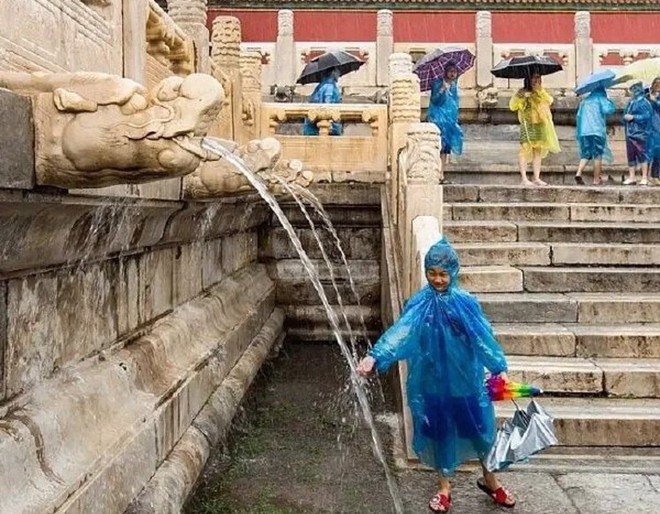 Một cảnh tượng hiếm thấy xuất hiện ở Cố cung: "Cửu long phun nước". Những chiếc đầu rồng bằng đá nhô ra xuất hiện rất nhiều ở các cung điện thật ra chính là đường ống dẫn nước thuộc hệ thống thoát nước dày đặc của Cố cung.