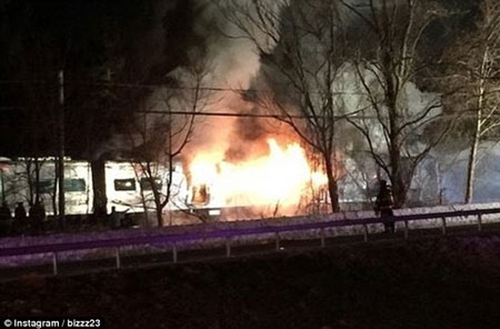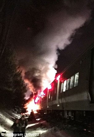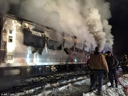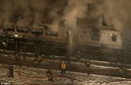 Các toa tàu bốc cháy trong vụ tai nạn. Ảnh: Daily Mail |