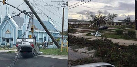 Hình ảnh cột điện đổ, ô tô bị lật ngược, cây cối bị giật đổ nằm lăn lóc trên đường mô tả sức hủy diệt kinh hoàng của "quái vật" Soudelor ở Saipan, thủ phủ của quần đảo Bắc Mariana, thuộc Mỹ khi nó đổ vào khu vực vào ngày 2.8 |