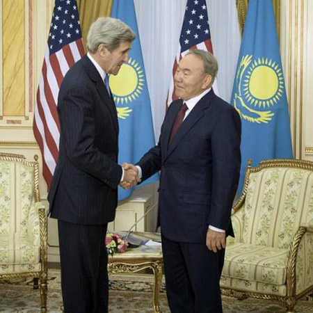Ngoại trưởng Mỹ John Kerry và Tổng thống Kazakhstan Nursultan Nazarbayev bắt tay trước khi một cuộc họp tại Dinh Tổng Thống ở Astana, ngày 02 tháng 11 năm 2015. Ảnh: Reuters |
