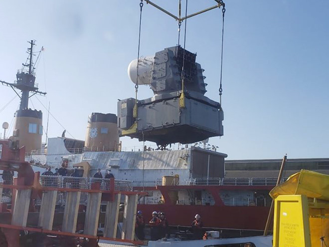 Song song là việc tháo dỡ dàn pháo đánh chặn tầm gần Phalanx (điều khiển bằng radar) ở đuôi tàu và dàn radar tìm kiếm mục tiêu trên không SPS-40 (tầm trinh sát tối đa 450 km, ở trên đỉnh tháp tín hiệu phía sau tàu).