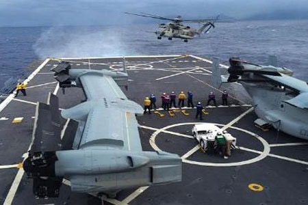 Trực thăng vận tải MV-22 Osprey trên tàu đổ bộ tấn công Mỹ |