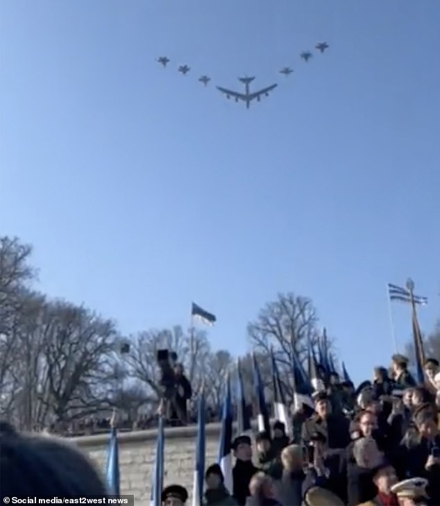 Bảy chiếc B-52H Stratofortress - có năng lực hạt nhân - đã bay theo đội hình từ căn cứ Fairford ở Gloucestershire - Anh qua miền Đông Estonia dưới sự hộ tống của các chiến đấu cơ F35 và F-A18.
