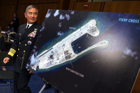 Đô đốc Harry B.Harris, Tư lệnh Hạm đội Thái Bình Dương của Mỹ, đứng cạnh bức ảnh chụp một hòn đảo do Trung Quốc xây dựng trái phép trên đá Chữ Thập ở quần đảo Trường Sa của Việt Nam. Ảnh: AP |