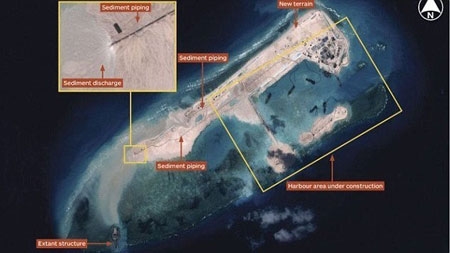 Trung Quốc xây dựng công trình trái phép trên đá Gạc Ma thuộc quần đảo Trường Sa của Việt Nam. Ảnh: IHS Jane’s Defense |
