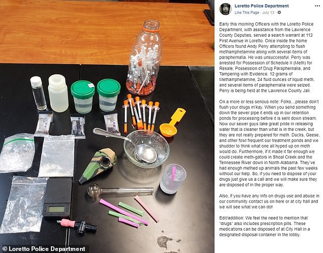 Thông báo này được đưa ra sau khi cảnh sát ở thị trấn Loretto đột kích vào nhà một kẻ buôn bán ma túy tên Andy Perry vào thứ 7 vừa qua. Trước đó, gã đã cố gắng xả methamphetamine và đồ dùng liên quan xuống cống để xóa dấu vết.