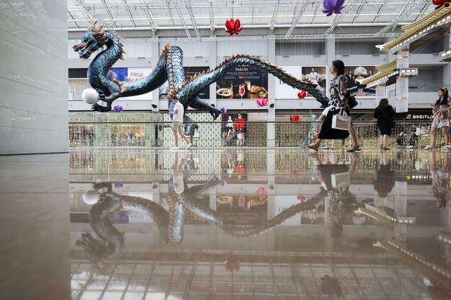 Trong hình ảnh được báo chí địa phương đăng tải, khách hàng ăn mặc cầu kỳ vừa sắm sửa vừa khoe dáng bên những khung cảnh được trang hoàng lộng lẫy, từ nghệ thuật sắp đặt ánh sáng hình rồng khổng lồ đến các màn biểu diễn lân - sư - rồng hoành tráng.
