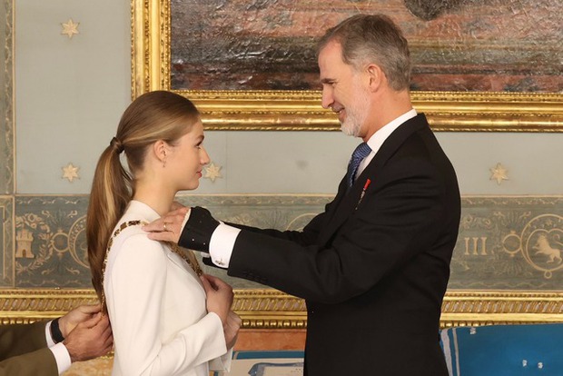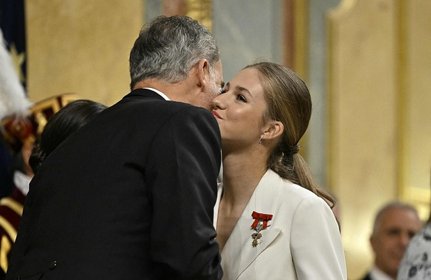 Một khoảnh khắc cảm động khác là khi Vua Felipe trao tặng con gái Huân chương Carlos III. Sau buổi lễ, Nữ thân vương 18 tuổi hôn lên má mẹ mình là Vương hậu Letizia trong khi cha mẹ cô tự hào nắm tay cô như một cử chỉ ủng hộ, khích lệ.