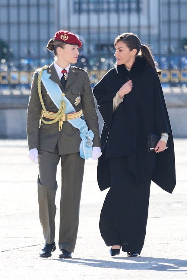 Vị nữ vương tương lai 18 tuổi được nhận xét là trông rất đĩnh đạc khi đến dự sự kiện Pascua Militar (Lễ Phục sinh Quân đội) tại Cung điện Hoàng gia Madrid trong bộ quân phục.