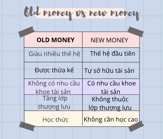 Old money thuộc tầng lớp thượng lưu, không có nhu cầu khoe khoang tài sản bởi lẽ ai cũng biết họ giàu. Vì gia đình có điều kiện nên họ được đầu tư toàn diện về mặt giáo dục, thường theo học những ngôi trường đại học danh giá hàng đầu thế giới. Ngược lại, new money vì mới giàu nên không được xếp vào giới thượng lưu, họ có nhu cầu khoe khoang tài sản hơn để chứng tỏ bản thân và "quảng bá" sự giàu có của mình. Việc quảng bá này phần nào giúp ích cho việc kinh doanh lẫn nâng cao uy tín, tuy nhiên đôi lúc cũng gây ra tác dụng ngược là khiến họ bị ghét vì khoe mẽ.