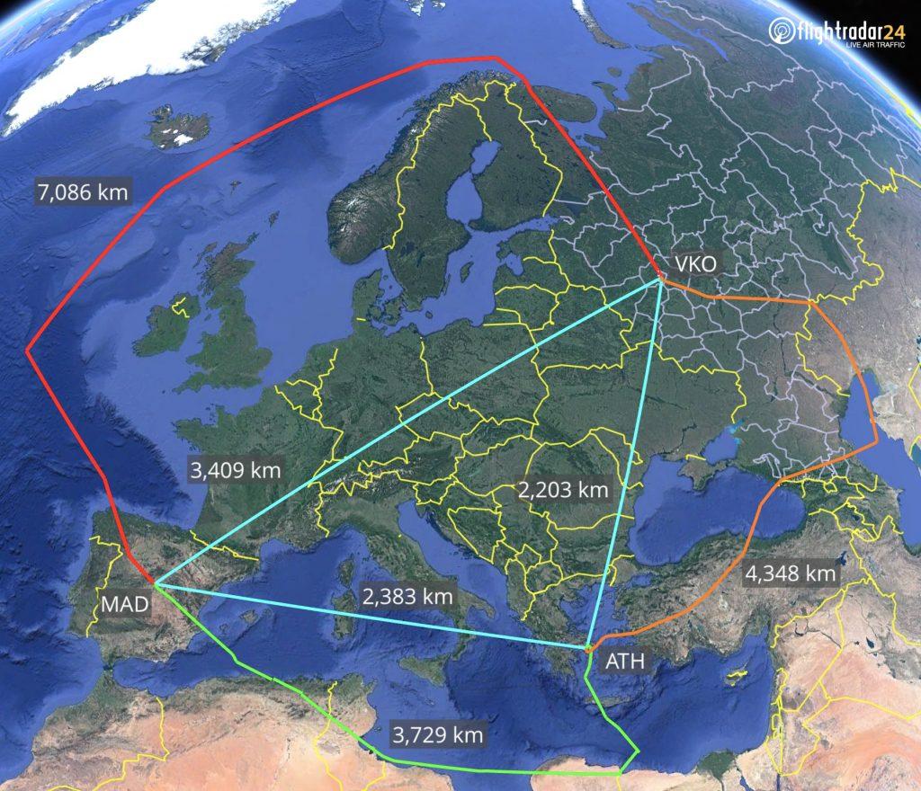 Cụ thể, máy bay ban đầu khởi hành từ Moscow tới Tây Ban Nha. Quãng bay này thông thường chỉ dài 3.409km, song máy bay Nga phải đi vòng 7.086km vì luôn phải duy trì hướng đi trong không phận quốc tế.