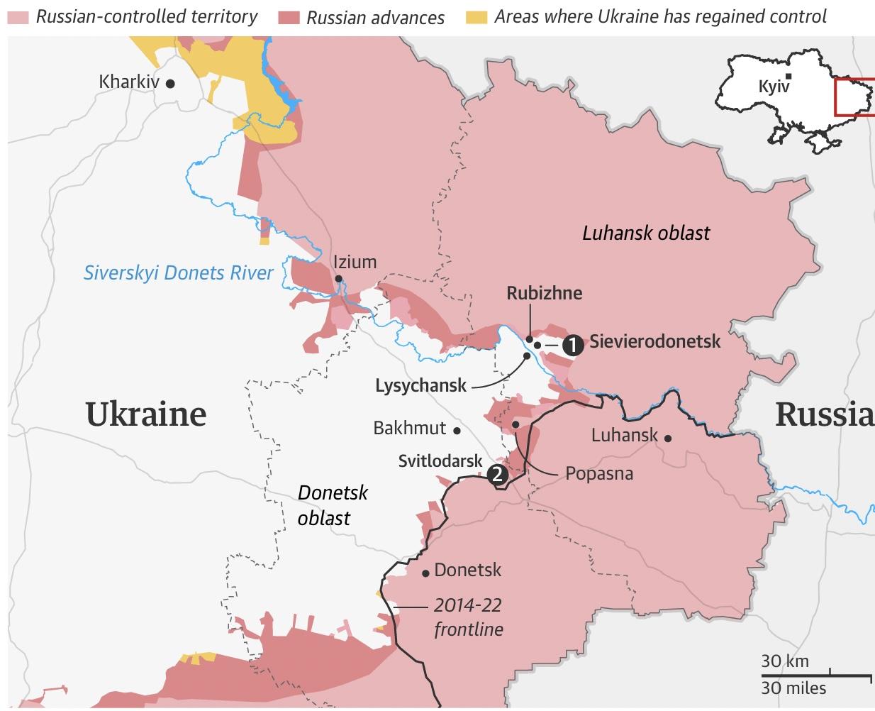 Nga đã đổ hàng nghìn quân vào khu vực này, mở các cuộc tấn công từ ba phía nhằm bao vây lực lượng Ukraine đang kháng cự ở thành phố Sievierodonetsk và Lysychansk. Nếu hai thành phố này thất thủ, toàn bộ vùng Luhansk sẽ nằm trong tay Nga.