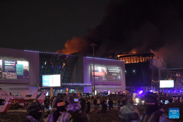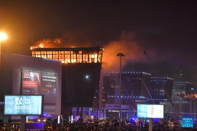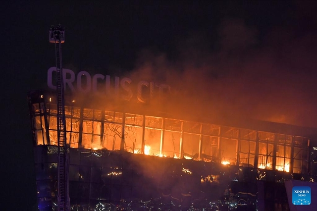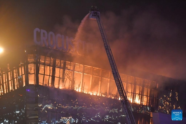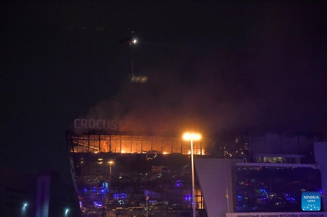 Theo hãng tin TASS, khoảng 1/3 khu phức hợp Crocus City Hall - nơi xảy ra vụ xả súng - đã chìm trong biển lửa trong khi một số video chưa được xác nhận cho thấy máy bay trực thăng đã được điều động để dập tắt đám cháy.