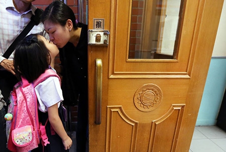Một em nhỏ Hồng Kông (Trung Quốc) chào tạm biệt mẹ trước của lớp trong ngày đầu khai giảng. |