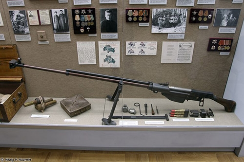 | Súng chống tăng hạng nặng PTRD-41 dùng cỡ đạn 14,5mm, tầm bắn hiệu quả 300m. |