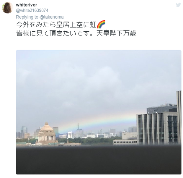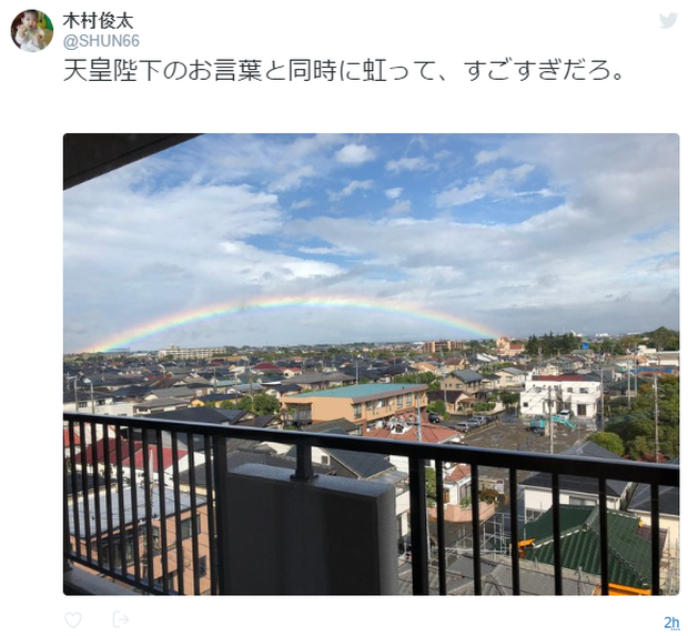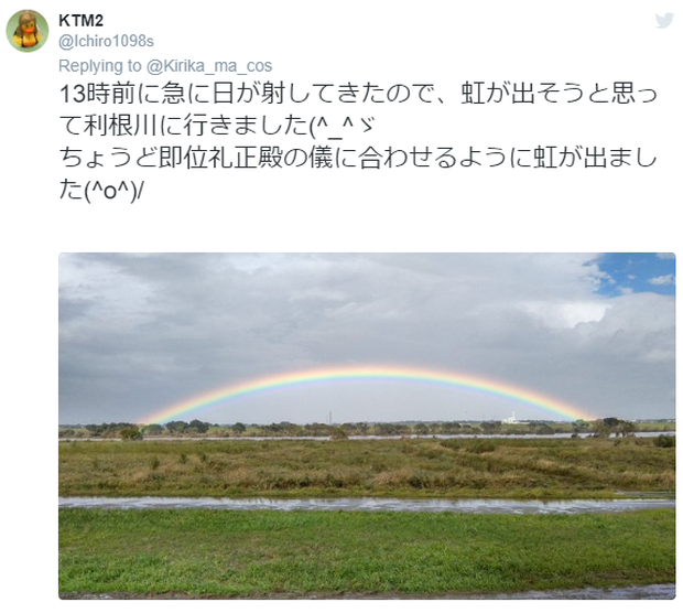Không chỉ là một sự kiện được người dân ngóng chờ mà vào thời điểm Nhật hoàng chuẩn bị bài phát biểu tiếp nhận ngai vàng, người dân nước này đã phát hiện ra những sự trùng hợp đến ngỡ ngàng. Vào khoảng 13h15', người dân thành phố Tokyo đã nhìn thấy một dải cầu vồng lớn, khá rõ nét xuất hiện. Cùng với sự xuất hiện của dải cầu vồng, núi Phú Sĩ cũng đã đón đợt tuyết rơi đầu tiên của mùa thu năm nay.