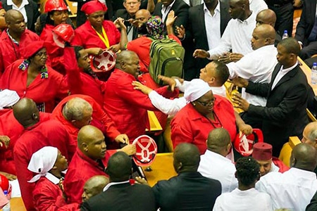 | Các nghị sĩ EFF (áo đỏ) lao vào ẩu đả với lực lượng an ninh |