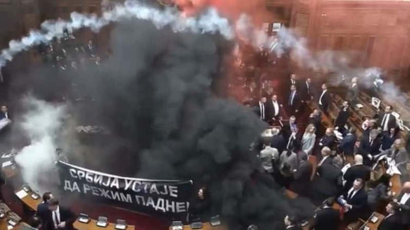 Tại phiên họp hôm 04/03, sau khi liên minh cầm quyền do đảng Serbia Tiến bộ (SNS) thông qua chương trình nghị sự, một số nghị sĩ rời khỏi chỗ ngồi chạy tới vị trí của chủ tịch quốc hội Ana Brnavic và giằng co với nhân viên an ninh.