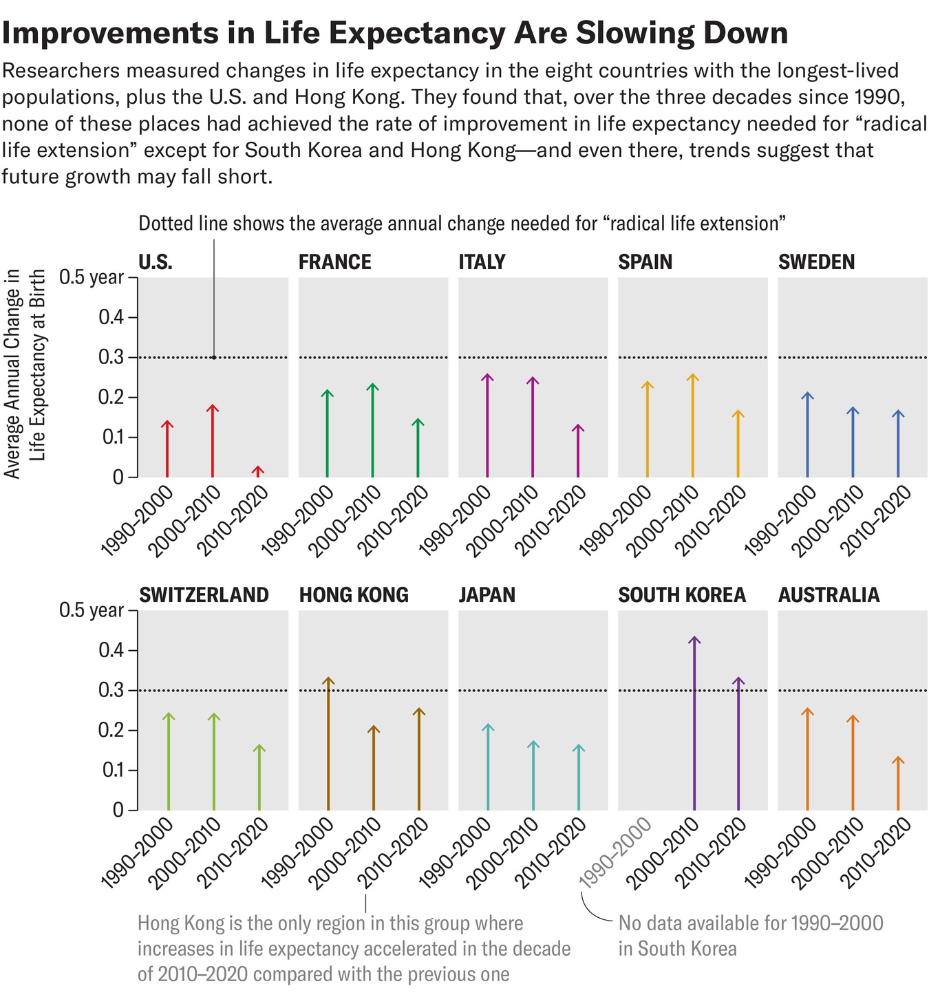 Olshansky và cộng sự đã thực hiện một cách tiếp cận đơn giản: họ xem xét các thay đổi quan sát được trong tỷ lệ tử vong và tuổi thọ từ năm 1990 đến 2019 tại tám quốc gia có tuổi thọ cao nhất thế giới, bao gồm Nhật Bản, Hàn Quốc, Úc, Pháp, Ý, Thụy Sĩ, Thụy Điển và Tây Ban Nha, cùng với Mỹ và Hồng Kông (Trung Quốc). Nhóm phát hiện rằng tốc độ cải thiện tuổi thọ đã chậm lại ở hầu hết các nơi này, và thực tế là đã giảm ở Mỹ.