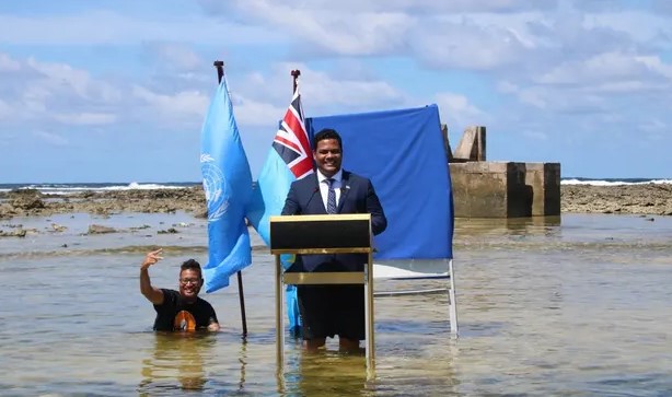 Những hình ảnh Ngoại trưởng Tuvalu Simon Kofe mặc suit, đeo cà vạt đứng trên bục diễn thuyết giữa biển, ống quần xắn cao để đọc diễn văn đã được chia sẻ rộng rãi trên mạng xã hội.