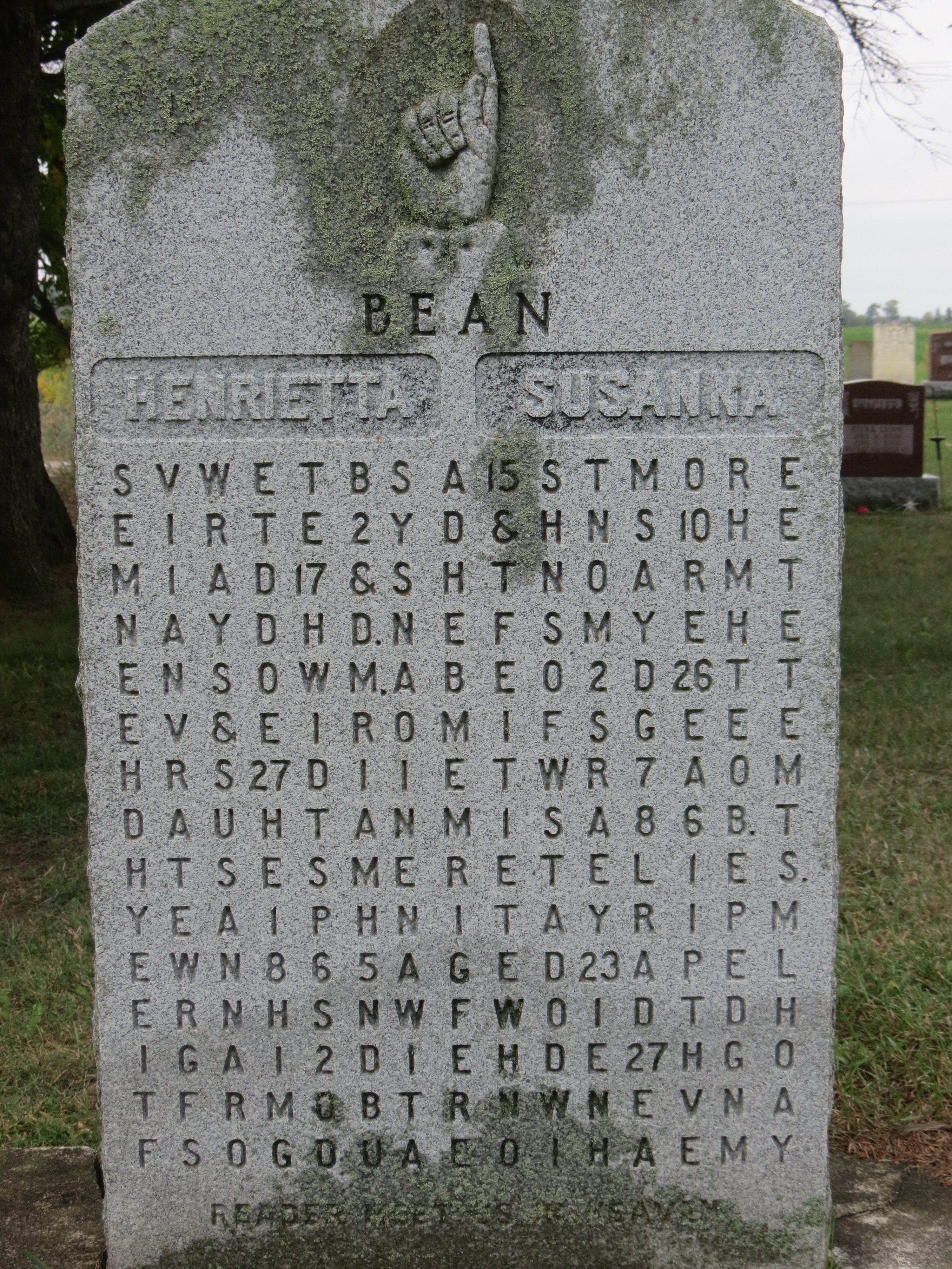 Từ đây, thông điệp mà bác sĩ Samuel giấu trên tấm bia mộ của 2 người vợ được ông John giải mã là: "Trong hai ngôi mộ này là Henrietta, vợ đầu của bác sĩ S. Bean, chết ngày 27/9/1865 khi mới 23 tuổi, 2 tháng, 17 ngày. Người vợ thứ hai, Susanna, qua đời vào ngày 27/4/1867 khi 26 tuổi, 10 tháng, 15 ngày. Họ là hai người vợ mà tôi không thể tìm được ai tốt hơn. Họ là các món quà mà Chúa trời ban tặng nhưng giờ đều đã ở trên thiên đường. Hy vọng Chúa sẽ để tôi gặp họ trên đó".