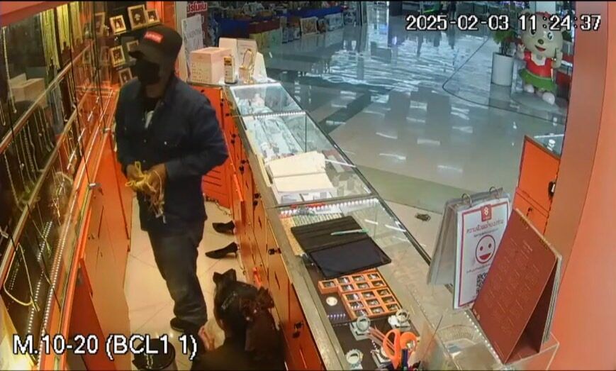 Vụ trộm xảy ra vào khoảng 11h30 sáng ngày 3/2 tại một tiệm vàng bên trong trung tâm thương mại. Số vàng bị đánh cắp trị giá hơn 6,6 triệu baht (hơn 5 tỷ đồng).