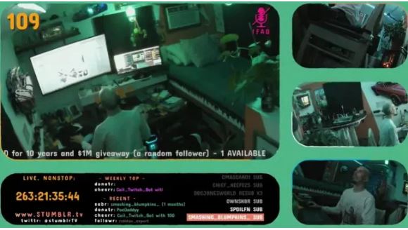 Tim Inzana (người Mỹ) là một streamer hoạt động trên nền tảng Twitch. Anh vừa dành 100 ngày đầu tiên của năm trong nhà kho và livestream 24/7 cho những người đăng ký theo dõi mình trên ứng dụng Twitch. Tim còn dự định không rời khỏi nơi ở hiện tại cho đến hết năm 2021 để quảng cáo cho một đề nghị độc đáo.