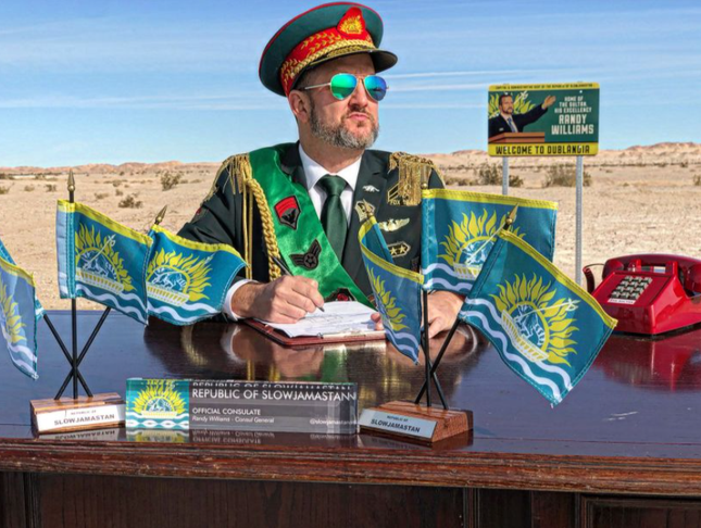 “Tôi muốn nói mọi thứ một cách đơn giản. Tôi đã đến thăm tất cả mọi quốc gia, vì vậy tôi đã tạo ra một quốc gia của riêng mình”, ông Randy “R Dub” Williams, một DJ “slow jam” (nhạc chậm) đến từ bang San Diego (Mỹ)cho biết. Mặc bộ vest đẹp nhất và đeo kính râm, quốc vương của Slowjamastan chính thức tuyên bố độc lập khỏi Hợp chủng quốc Hoa Kỳ vào ngày 1/12/2021 khi ông phát sóng trực tiếp cuộc ly khai tại “văn phòng” chính phủ ngoài trời của mình ở Dublândia, thủ đô của Cộng hòa Slowjamastan.