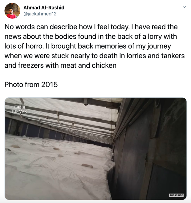 Đọc những tin tức về vụ việc 39 người tử vong trong xe container tại Essex, Anh những ngày qua, chắc hẳn ai cũng đều cảm thấy xót xa cho của những nạn nhân xấu số. Ahmad al-Rashid, một người chuyển từ Syria đến Anh năm 2015 cũng đã thể hiện sự đồng cảm và đau xót của mình với những người đã khuất ngay trên Twiiter của mình. Bởi hơn ai hết, anh hiểu rất rõ nỗi khổ đó khi bản thân cũng từng là người nhập cư đến nước Anh bên trong một chiếc "container địa ngục"