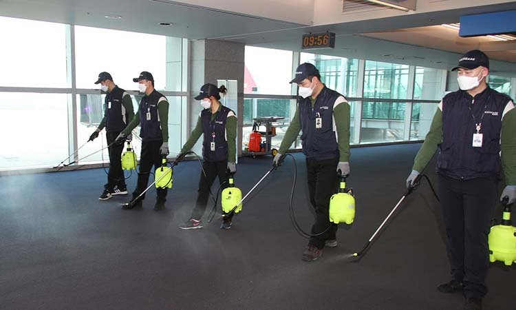 Nhân viên tiến hành khử trùng sàn sân bay quốc tế Incheon, Hàn Quốc ngày 24/1. Ảnh: Reuters.