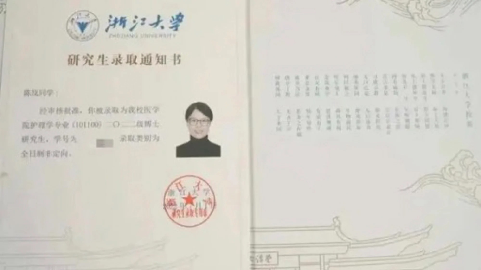 Cuối cùng, cô đã vượt qua bài kiểm tra đầu vào sơ bộ năm ngoái rồi cả kỳ phúc khảo vào tháng 5 năm nay. Tháng 8, Chen chính thức nhận được giấy gọi nhập học của Đại học Chiết Giang.