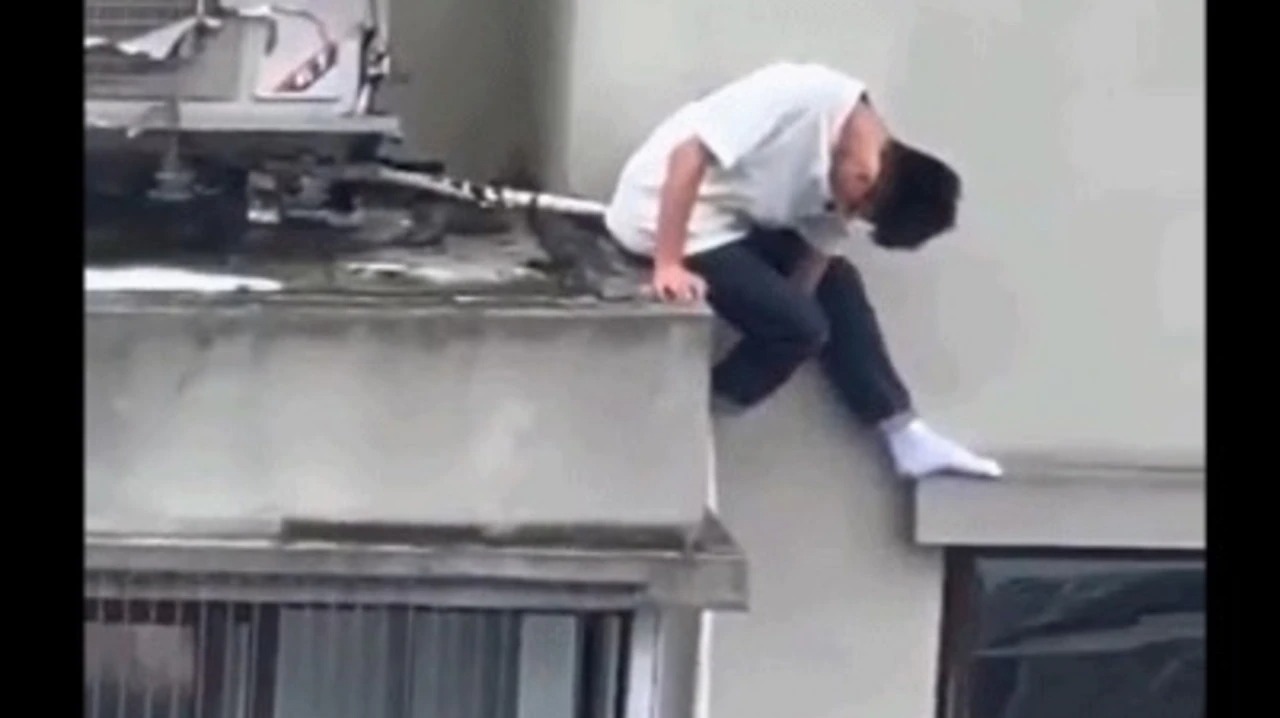 Tuy nhiên khi nhìn thấy lực lượng cứu hộ tới nơi, người thanh niên bắt đầu leo từ trên tầng thượng xuống bằng cách tựa lưng vào thành tường còn tay thì cố gắng bám vào các gờ cửa sổ nhô ra tại các tầng.