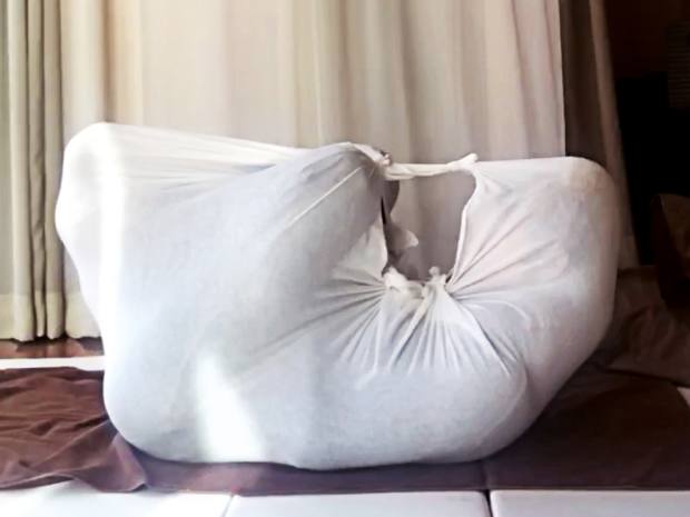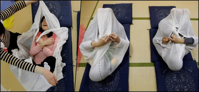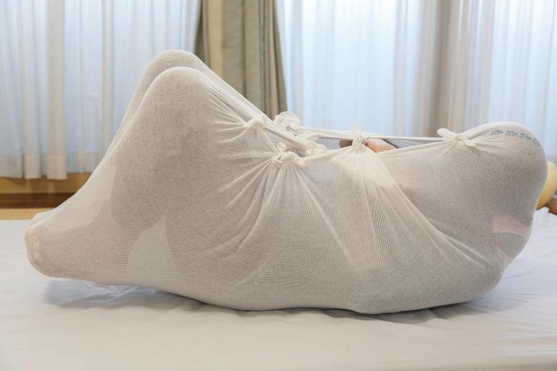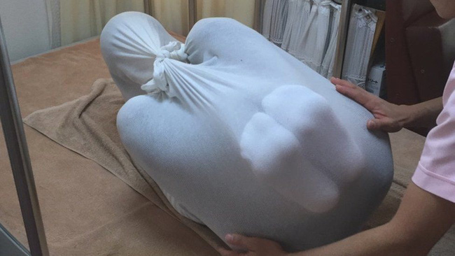 Cái tên nói lên tất cả, đó là phương pháp kỳ lạ mà ở đó, người được trị liệu sẽ nằm vào lên tấm vải có độ co giãn, người bên ngoài buộc chặt lại. Vậy nên, trông những bức ảnh giống như thể có vụ bạo hành nghiêm trọng xảy ra nhưng thực chất lại là cách chữa bệnh của người Nhật.