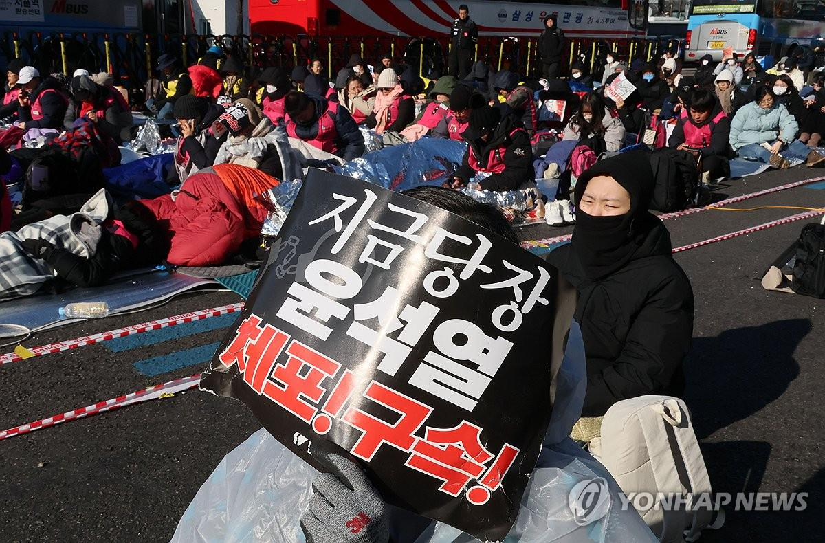 Chỉ cách những người ủng hộ ông Yoon khoảng 400m là các thành viên của Liên đoàn Công đoàn Hàn Quốc (KCTU), phe kêu gọi thi hành lệnh bắt giữ. Những người phản đối ông Yoon đã cố gắng tổ chức tuần hành ở gần dinh thự của Tổng thống, nhưng bị cảnh sát ngăn cản. Đã có xô xát xảy ra sau đó, và 2 người bị bắt vì tấn công cảnh sát.