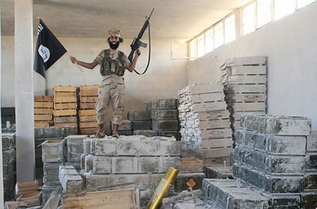 Một tay súng IS trong kho vũ khí vừa chiếm được từ quân đội chính phủ Syria. Ảnh: Spioenkop