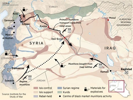 Các tuyến đường tiếp tế vũ khí, đạn dược cho phiến quân IS. Đồ họa: ISW