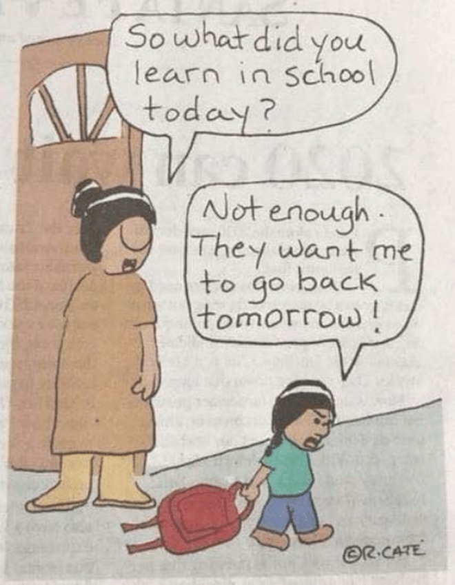 Trong nội dung gốc của bức tranh, người mẹ hỏi đứa con "Hôm nay có học được gì ở trường không?" và đứa con đáp lại "Có nhưng không đủ. Người ta còn muốn con quay lại vào ngày mai".