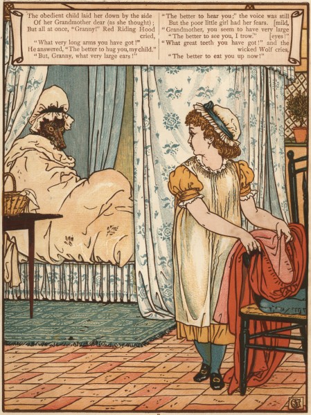 Thực tế, câu chuyện Cô bé quàng khăn đỏ có nguồn gốc ở Pháp từ tận thế kỷ thứ 10, trước khi nó được truyền miệng sang tận nước Ý. Nhân vật phản diện trong câu chuyện ấy là một con yêu tinh thay vì sói. Yêu tinh không chỉ ăn thịt và giả dạng làm bà của cô bé quàng khăn đỏ mà nó còn dùng các phần cơ thể của nạn nhân để nấu thức ăn.
