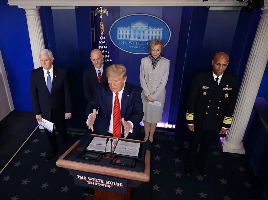Buổi họp báo hôm 23/03 của ông Donald Trump có sự tham gia của phó tổng thống Mike Pence, Bộ trưởng Tư pháp William Barr và tiến sĩ Deborah Birx, thành viên nhóm chuyên trách phản ứng Covid-19 của Nhà Trắng.