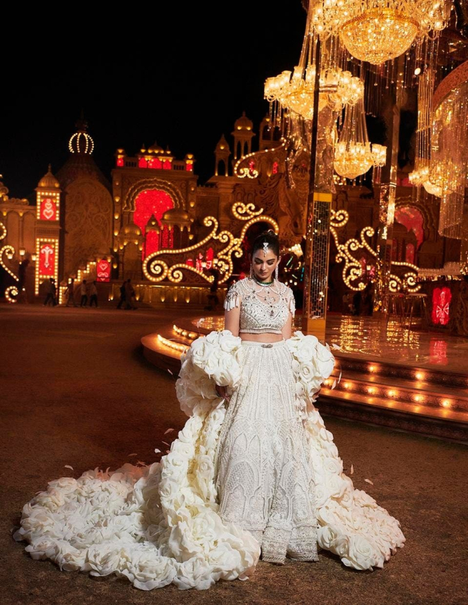 Diện mạo mà cặp vợ chồng tạo ra cho tiểu thư Isha Ambani là Lehenga, kiểu trang phục của Ấn Độ bao gồm 2 mảnh - một chiếc áo ngắn và một chiếc váy dài.